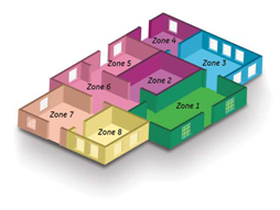 Several zones can be defined in order to manage activate and disable the system. In case of alert, the control panel shows the nature of the alert (intrusion, fire) and the location.